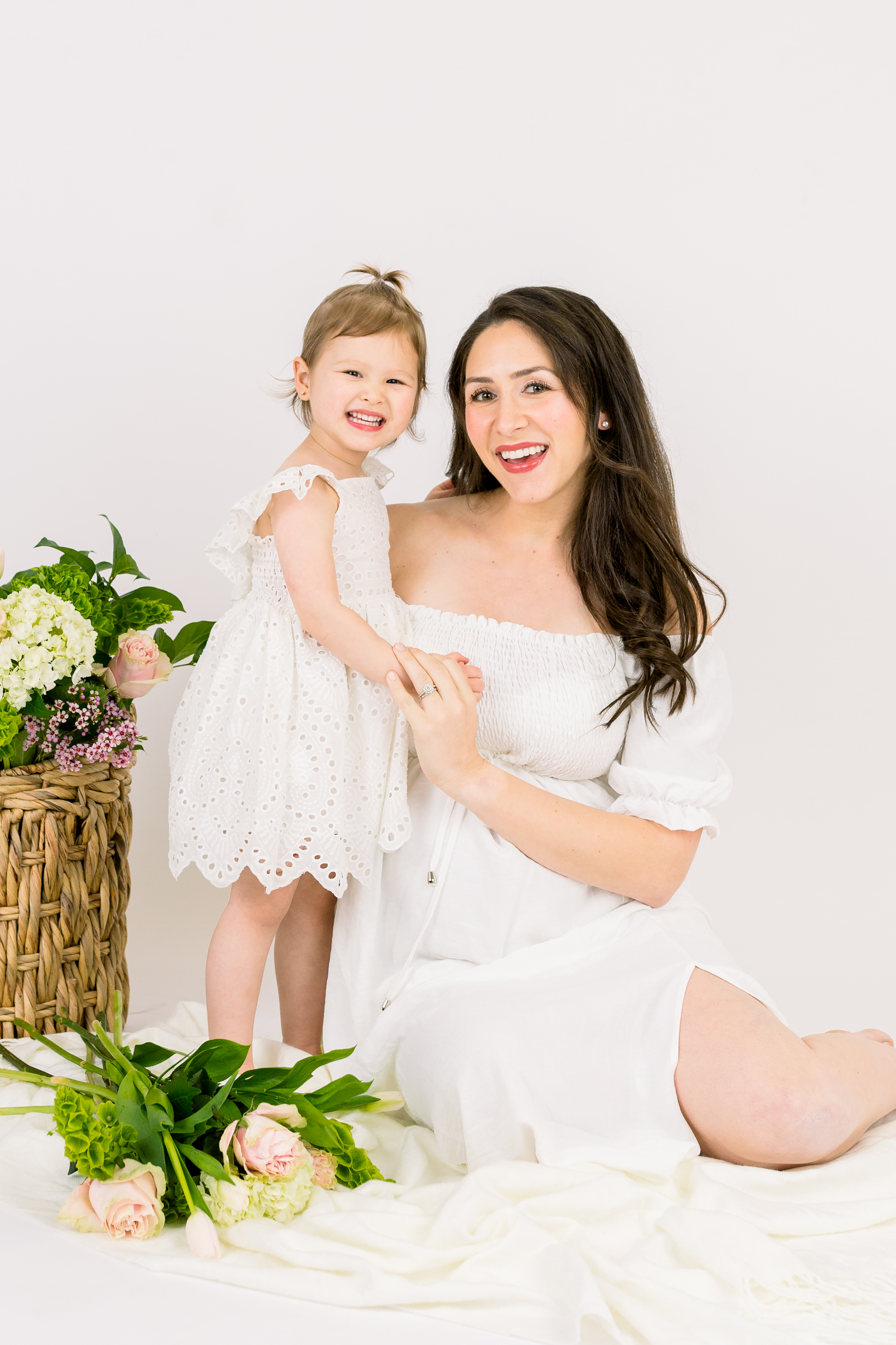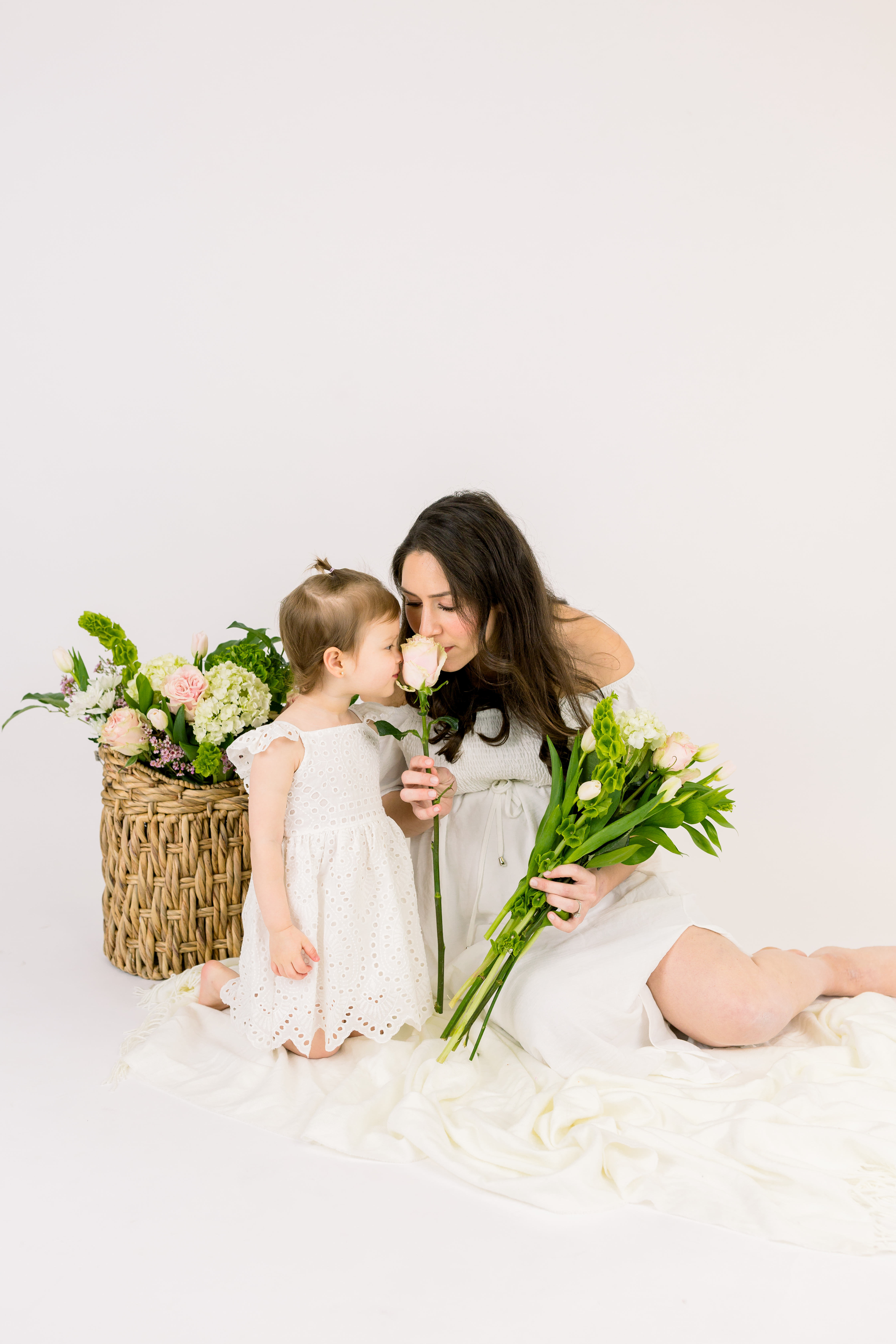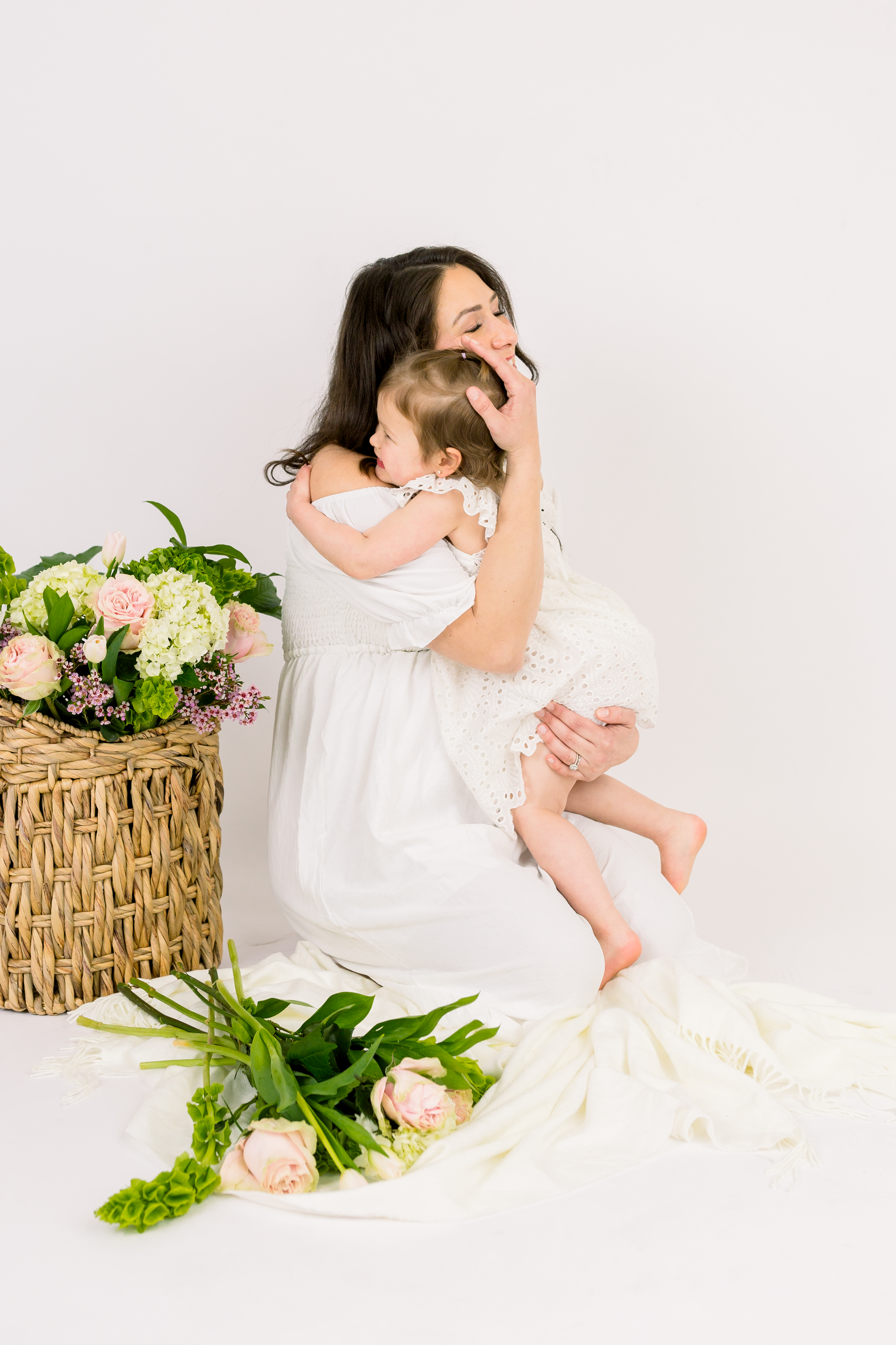 The sessions will be held indoors at a studio located in Brea (Orange County). We’ll be warm, dry and comfortable. They’ll have a white backdrop with a basket of fresh flowers, along with a bouquet for you to hold and play with. See more details below.